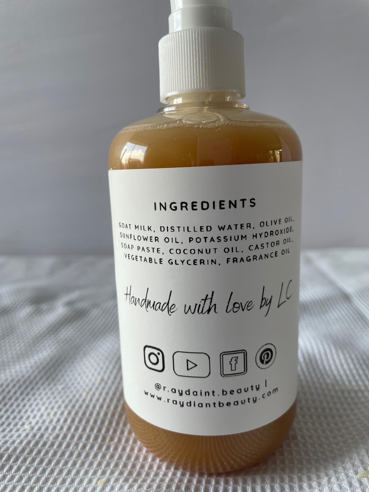 Carefully handcrafted using a skin-loving formula, this handmade goat milk liquid soap combines distilled water, olive oil, sunflower oil, coconut oil, and castor oil to create a rich, gentle lather. The addition of vegetable glycerin helps lock in moisture, making this an ideal hydrating liquid soap for dry and sensitive skin.